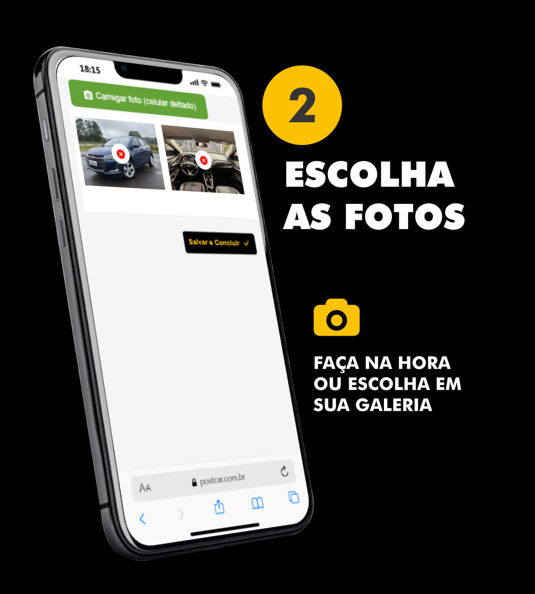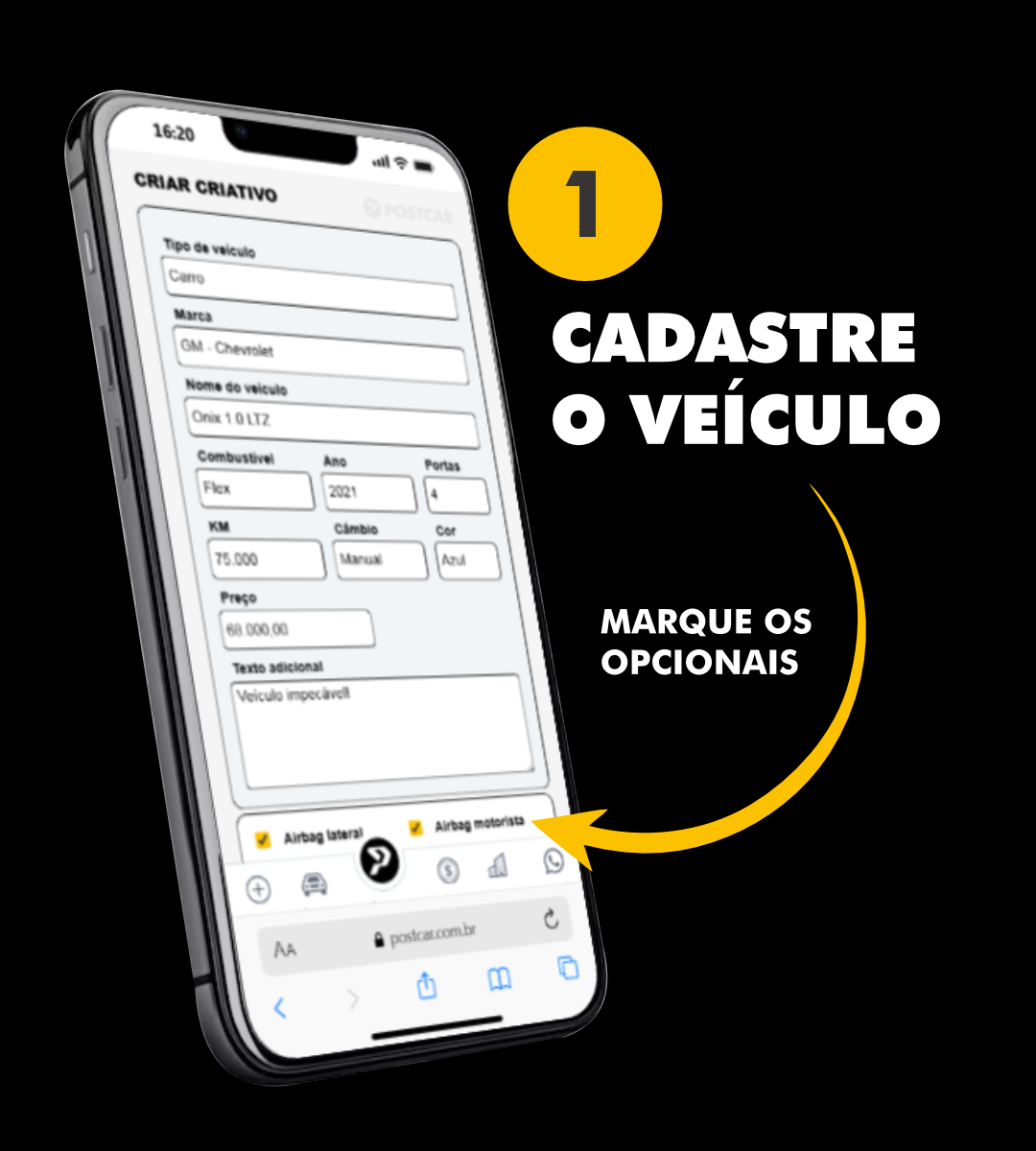 Basta cadastrar os dados do veículo, escolher os opcionais e tirar a foto.