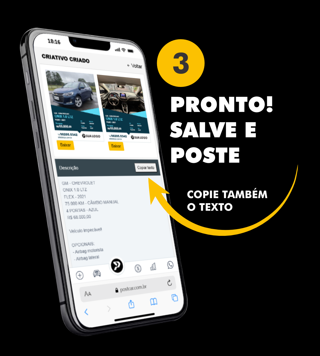 O sistema gera automaticamente os dados do veículo, opcionais, contatos e localização da sua loja.
